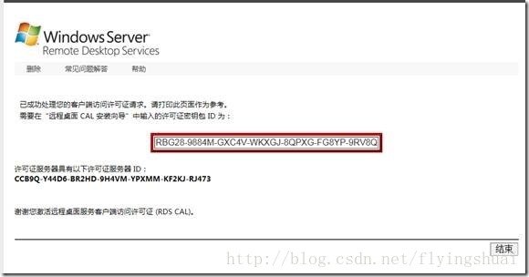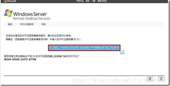 5) 可以得到”已成功處理您的許可證服務(wù)器啟動(dòng)申請(qǐng)。你的許可證ID是:…”,又是一個(gè)需要抄下的分為七段的35位數(shù),里面包含有數(shù)字也有大寫的英文字母;并且還會(huì)問(wèn)你”需要此時(shí)獲取客戶機(jī)許可證嗎?”選擇”是”