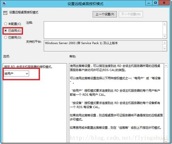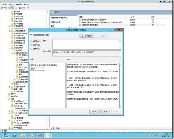 4) 運(yùn)行—>gpedit.msc->計(jì)算機(jī)配置—管理模板—windows組件—遠(yuǎn)程桌面服務(wù)—遠(yuǎn)程桌面會(huì)話主機(jī)—-授權(quán), 找到 “設(shè)置遠(yuǎn)程桌面授權(quán)模式”,設(shè)置為啟用,并在“指定RD 會(huì)話主機(jī)服務(wù)器授權(quán)模式”中,選擇“按用戶”。
