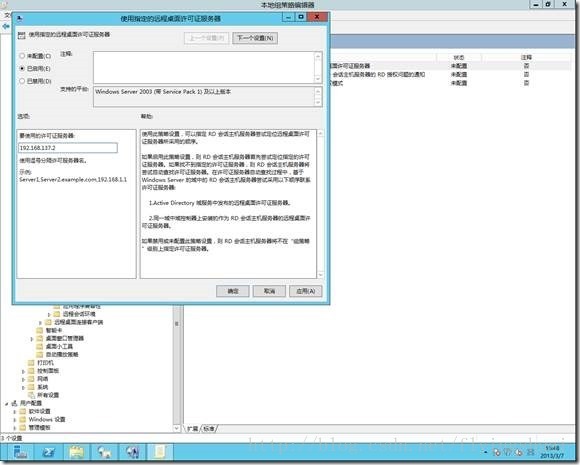 2) 運(yùn)行—>gpedit.msc->計(jì)算機(jī)配置—管理模板—windows組件—遠(yuǎn)程桌面服務(wù)—遠(yuǎn)程桌面會(huì)話主機(jī)—-授權(quán), 找到 “使用指定的遠(yuǎn)程桌面許可服務(wù)器”,設(shè)置為啟用,并在“要使用的許可證服務(wù)器”中,設(shè)置當(dāng)前服務(wù)器的IP或者主機(jī)名。