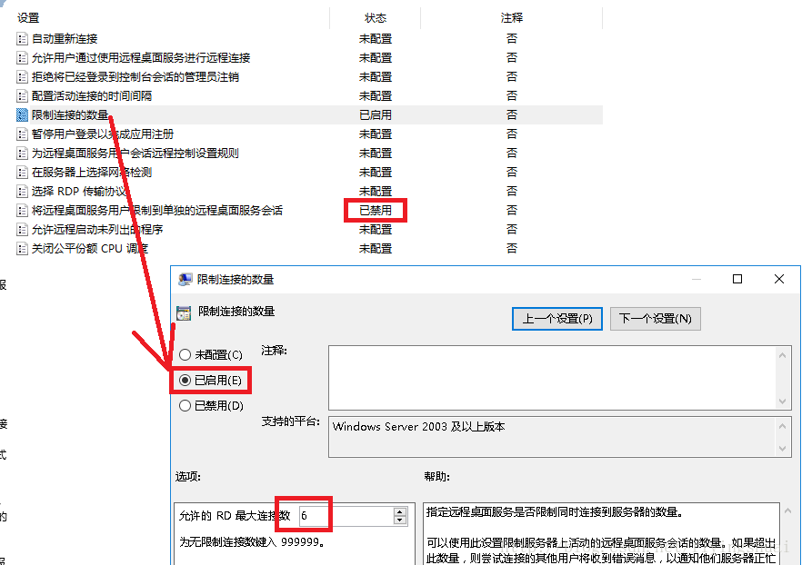 1) 運(yùn)行—>gpedit.msc->計(jì)算機(jī)配置—管理模板—windows組件—遠(yuǎn)程桌面服務(wù)—遠(yuǎn)程桌面會(huì)話主機(jī)—-連接,可以在“限制連接的數(shù)量”中設(shè)置最大連接數(shù)量(默認(rèn)無(wú)限制)。如圖