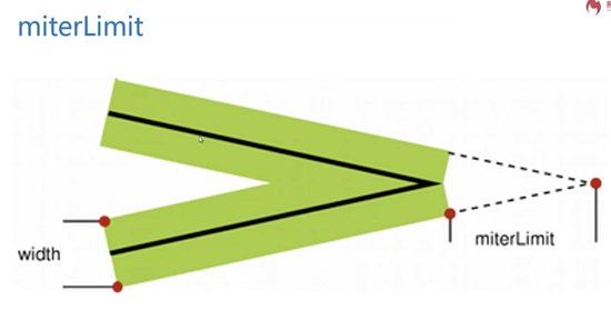 當產生miterLimit時一定是線條有寬度的,有寬度的線條中間的線的尖角與外邊尖角直接的距離。