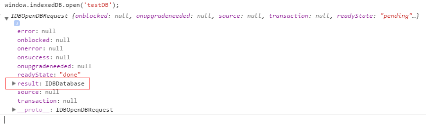 在IndexedDB大部分操作并不是我們常用的調用方法,返回結果的模式,而是請求——響應的模式,比如打開數據庫的操作