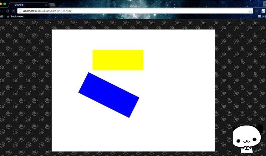 解釋一下過程:每當我們調用 setTransform() 時,它都會重置前一個變換矩陣然后構建新的矩陣,因此在下面的例子中,不會顯示紅色矩形,因為它在藍色矩形下面。