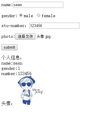 填寫(xiě)好信息后,點(diǎn)擊 submit,頁(yè)面中能得到以下效果,去服務(wù)器端對(duì)應(yīng)的文件夾下也能發(fā)現(xiàn)上傳的圖片。