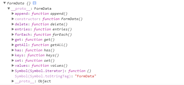 FormData 除了上面的創(chuàng)建新對(duì)象時(shí)直接將 form 作為參數(shù)傳入外,還有其他的功能。網(wǎng)上大部分關(guān)于 FormData 介紹的文章都只提到了append()方法,那么FormData 對(duì)象到底有些什么方法呢?我們console 一下就知道: