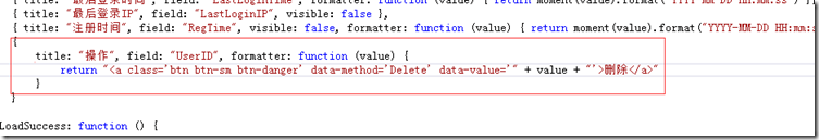 打開Index視圖找到表格初始化方法,添加“操作”列格式化列使其顯示一個刪除按鈕,代碼紅框部分。