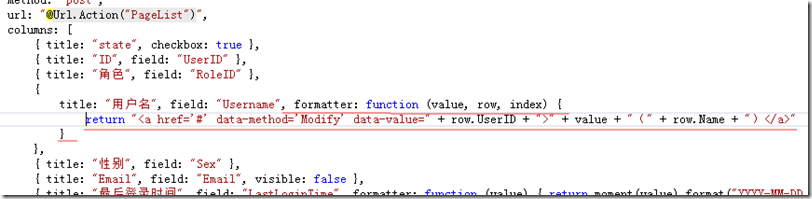 打開Index視圖找到表格初始化方法,格式化列“Username”使其顯示一個連接,代碼紅線部分。