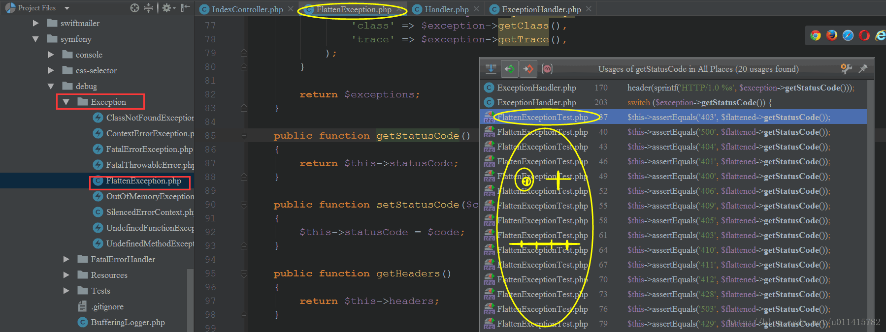 經過對框架源碼的查看發現,我們是通過實例化 FlattenException 類來獲得請求狀態碼的,根據提供的測試類 FlattenExceptionTest ,從而得出了上述的代碼,建議可以閱讀下源代碼以做比較