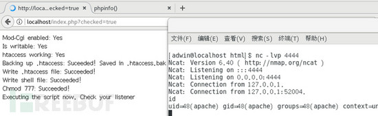 我們在本地開nc監聽4444端口,然后在瀏覽器中打開這個頁面,如果執行成功,將會反彈一個shell到4444端口: