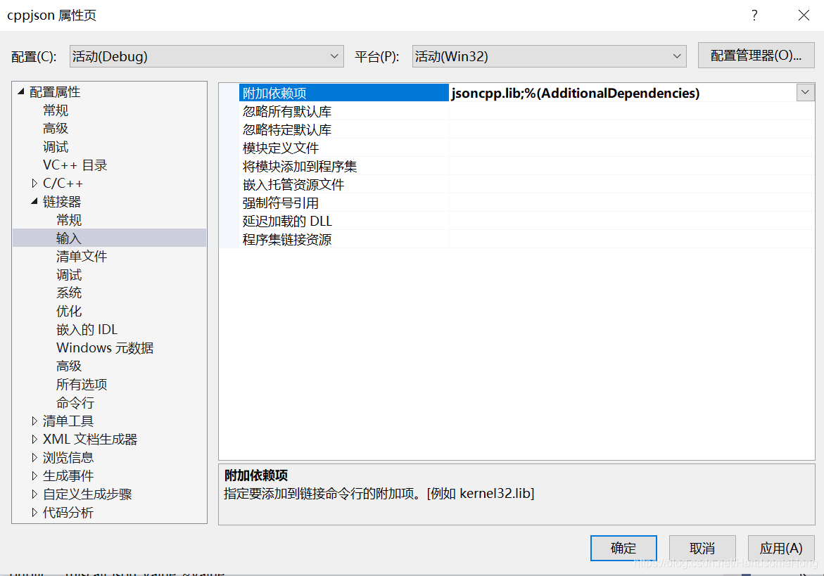 添加需要鏈接的庫,比如這里是jsoncpp.lib。