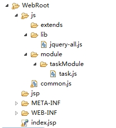 解釋一下:js主要包括extends(引入第三方的js)、module(項目模塊自己的js)、lib(引用包,這里也可以繼續拆分),module中包含具體的模塊中的js。common.js是核心命名空間的js.