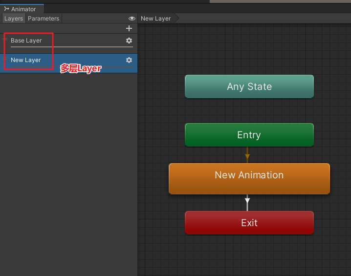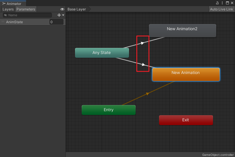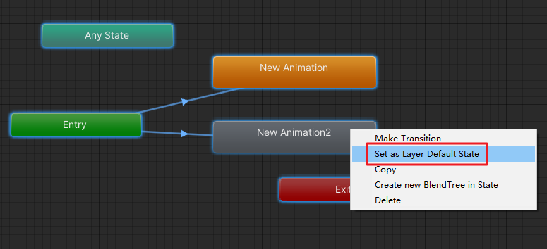 上面的代碼,讓AnimState這個參數值為0,滿足了從Any State到New Animation2的過渡條件,從而實現New Animation2動畫的過渡。