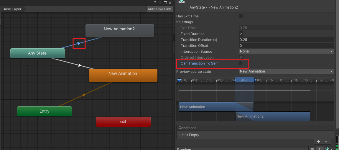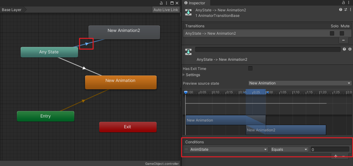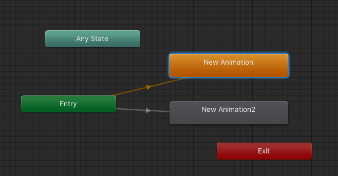 AnimState為0時會執(zhí)行這個動畫Any State到New Animation2的過渡