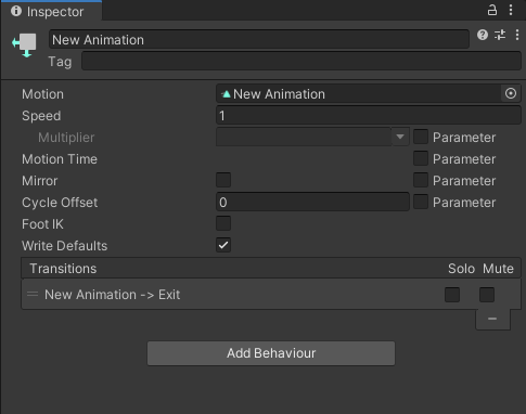 | Motion | 狀態(tài)對應的動畫。每個狀態(tài)的基本屬性,直接選擇已定義好的動畫(Animation Clip)即可 |