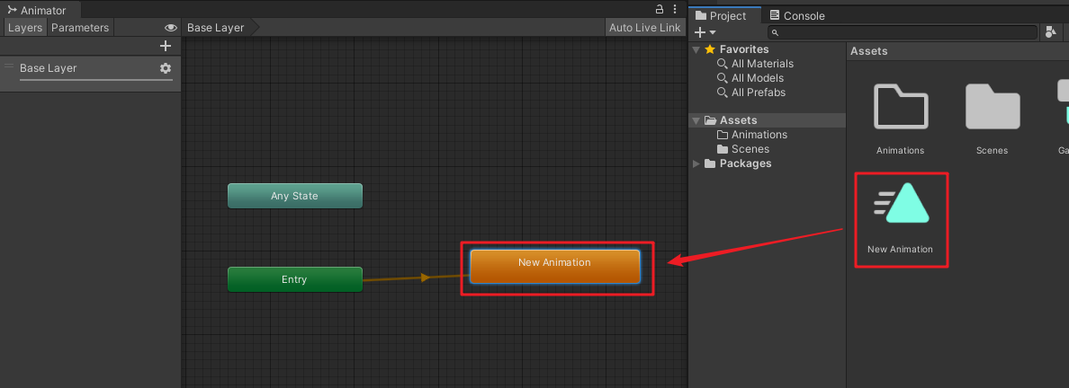 要創(chuàng)建一個從狀態(tài)A到狀態(tài)B的過渡,直接在狀態(tài)A上 鼠標右鍵 - Make Transition并把出現的箭頭拖拽到狀態(tài)B上點擊鼠標左邊即可。