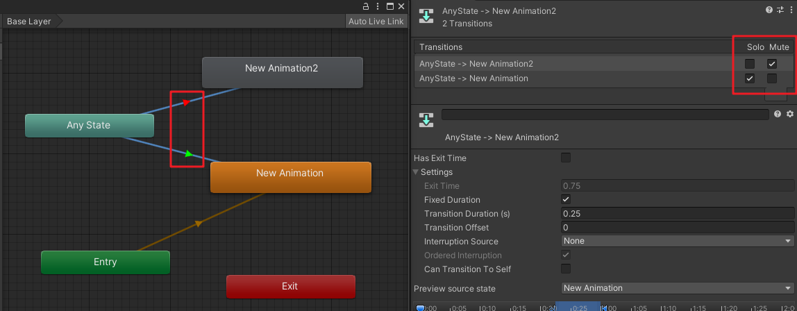 | Transitions | 該狀態(tài)向其他狀態(tài)發(fā)起的過渡列表,包含了Solo和Mute兩個參數,在預覽狀態(tài)機的效果時起作用 |