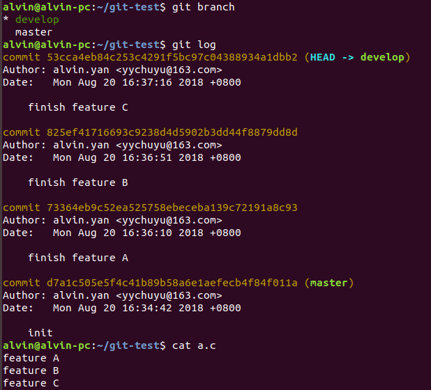 比如我現(xiàn)在有個(gè)文件a.c,我在develop分支完成了三個(gè)功能模塊:feature A,feature B,feature C。如下圖: