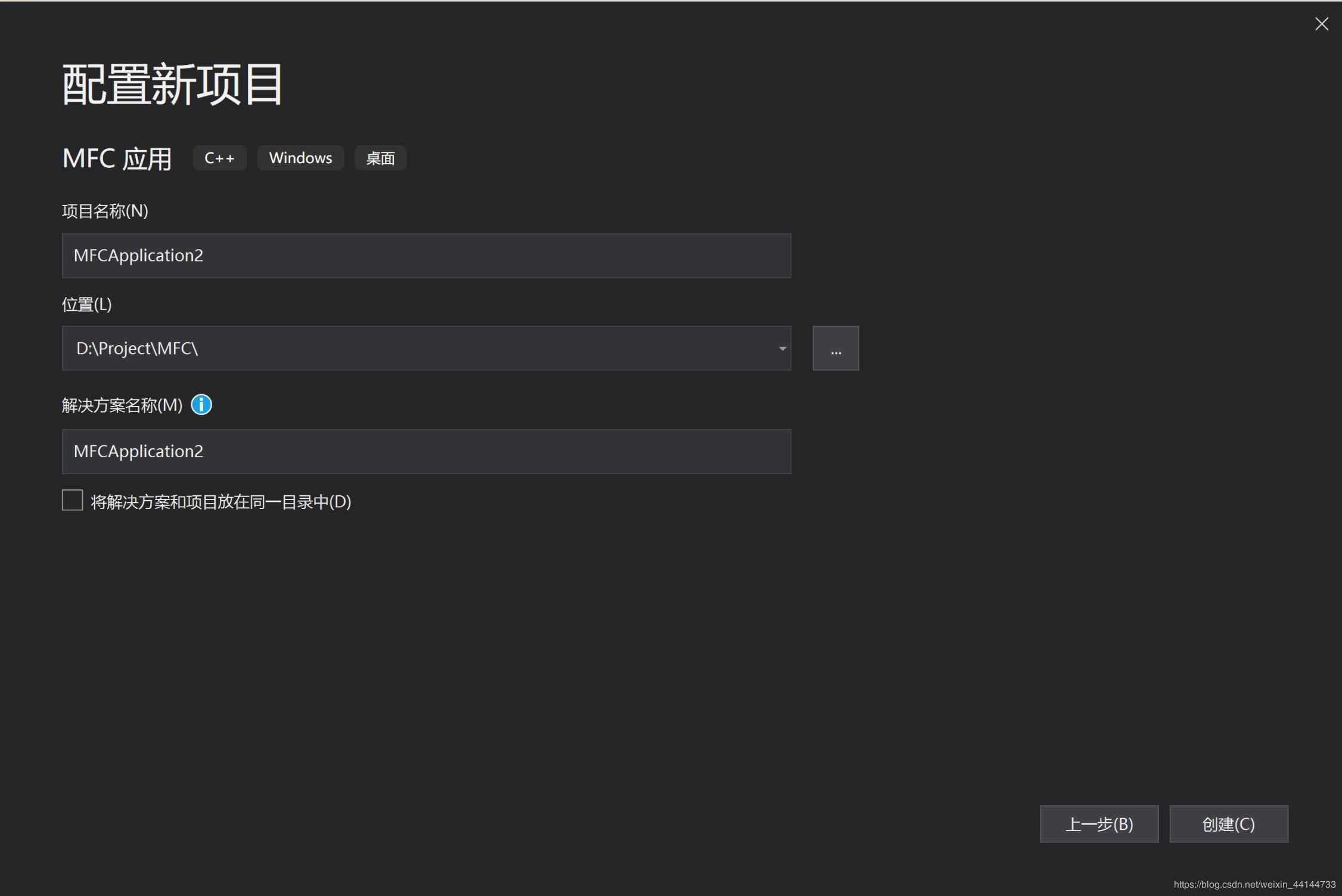 1、打開VS,點擊創建新項目,得到下圖,選擇MFC應用(找不到的話可以像我一樣直接搜索,搜索不到的話說明你沒安裝MFC環境)