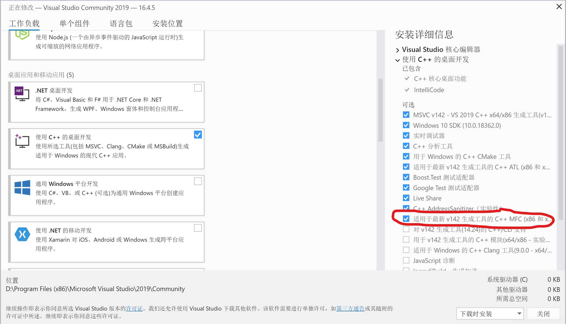 找到使用使用C++的桌面開發選項,便能找到如圖所示的MFC組件,安裝它