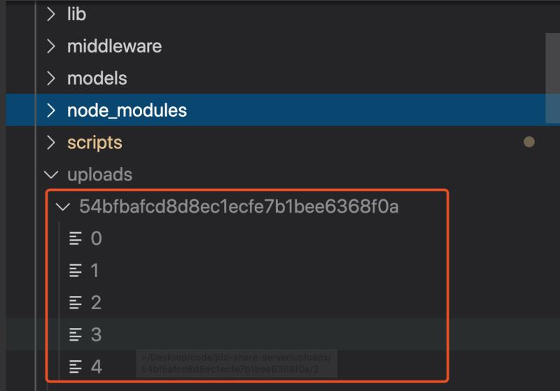 后臺接收到上傳請求后,首先查看名稱為文件 MD5 的文件夾是否存在,不存在則創建文件夾,然后通過 fs-extra 的 rename 方法,將切片從臨時路徑移動切片文件夾中,結果如下: