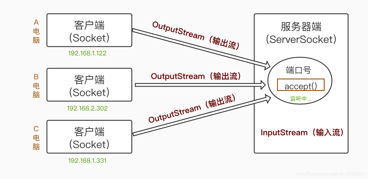 對于客戶端,我們需要使用Socket類來創(chuàng)建對象。對于服務(wù)器端,我們需要使用ServerSocket來創(chuàng)建對象,通過對象調(diào)用accept()方法來進(jìn)行監(jiān)聽是否有客戶端訪問。