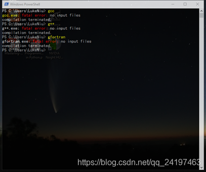 此處檢查一下編輯器是否可用,打開命令行窗口,輸入gcc, g++, 或者gfortran, 如果提示找不到輸入文件, 那么就表明GNU Complier環(huán)境變量配置成功了, 如果顯示: gcc/g++/gfortran is not recognized as the name of a cmdlet, function, script file, or operable program. 則表示GNU Complier環(huán)境變量沒有配置成功, 這是成功的: