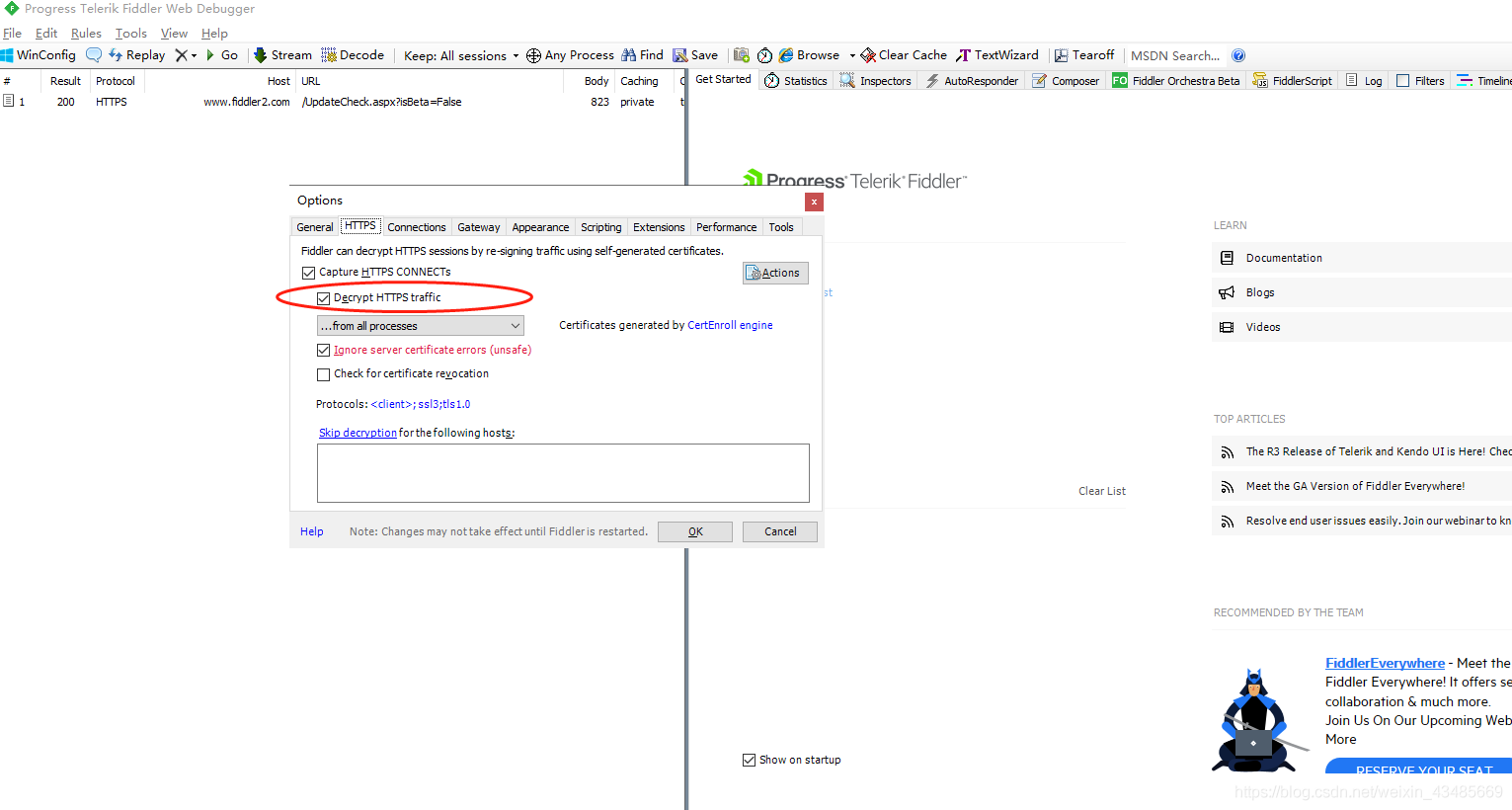 那么如何配置FIddler來解析這些加密的請求呢?方法一是查官網的安裝文檔,二是看提示,軟件公司還是很人性化的在返回內容里面提示了需要在哪里設置,就是第二行那一句: