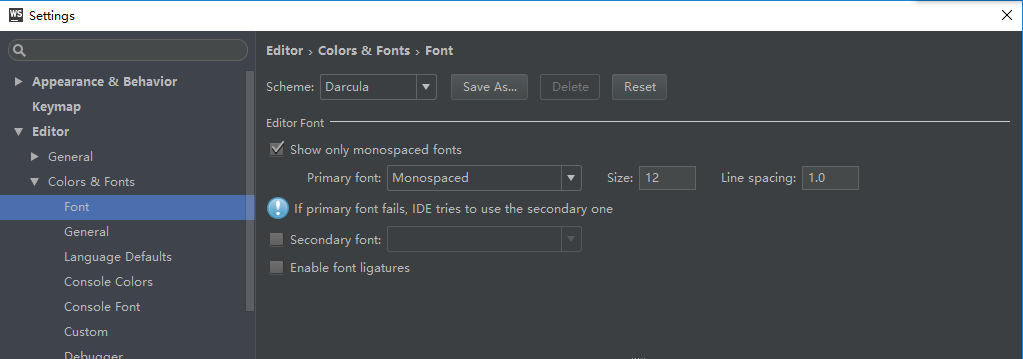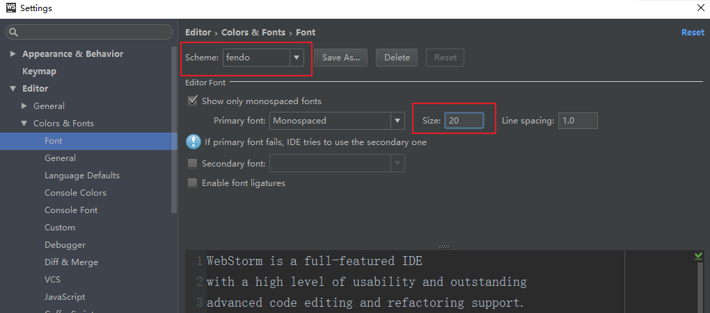 字體設置在Settings-->Editor-->ColorsFonts-->Font下面