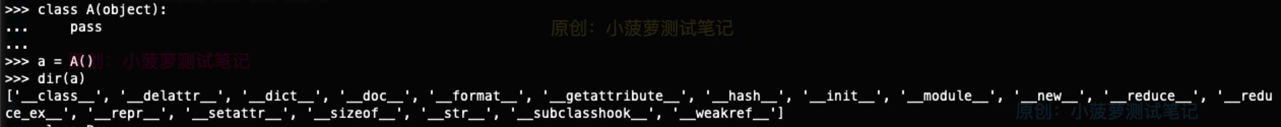 ['__class__', '__delattr__', '__dict__', '__dir__', '__doc__', '__eq__', '__format__', '__ge__', '__getattribute__', '__gt__', '__hash__', '__init__', '__init_subclass__', '__le__', '__lt__', '__module__', '__ne__', '__new__', '__reduce__', '__reduce_ex__', '__repr__', '__setattr__', '__sizeof__', '__str__', '__subclasshook__', '__weakref__']