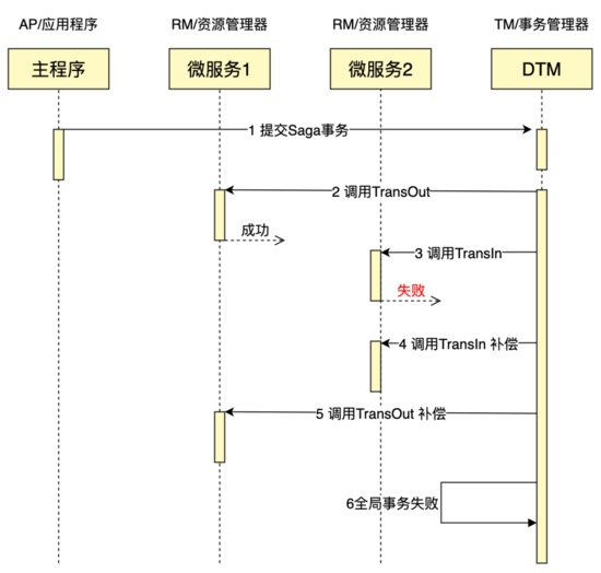 目前可用于 SAGA 的開源框架,主要為 Java 語言,其中以 seata 為代表。我們的例子采用 go 語言,使用的分布式事務框架為https://github.com/yedf/dtm,它對分布式事務的支持非常優雅。下面來詳細講解 SAGA 的組成: