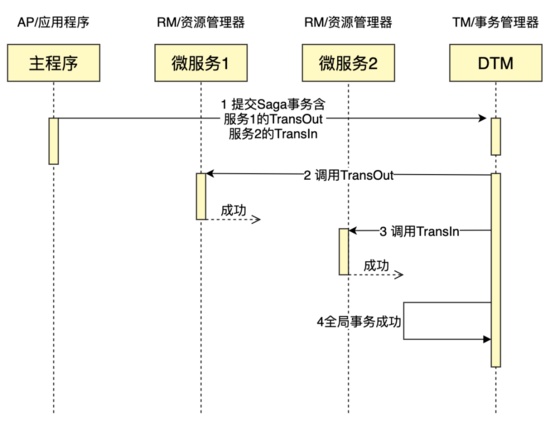 下面看一個成功完成的 SAGA 時序圖,就很容易理解 SAGA 分布式事務:
