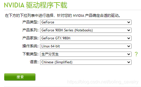 訪問Nvidia網站,地址https://www.nvidia.cn/Download/index.aspx?lang=cn,然后選擇對應的顯卡和操作系統,我的選擇如下圖所示: