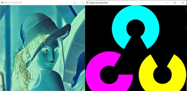按位取反就是將數值根據每個bit位1變0,0變1,比如0xf0按位取反就變成了0x0f,如果是uint8類型的數據,取反前后的數據相加結果為0xff(255)。下面的例子將lena.jpg和opencv-logo.png分別按位取反: