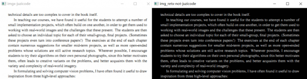 取反還有很多應用的地方,比如做OCR文字識別的時候,因為一般的書籍是白紙黑字,背景是白色,而要分析識別的字卻是黑色,在做完二值化之后要識別的字是黑色的,如果直接做圖像切割,分離出來的就是背景“白紙”而不是目標對象“黑字”了,而做完取反處理后就能達到切割目標白色文字的效果。下圖是”白紙黑字“取反前后的對比:
