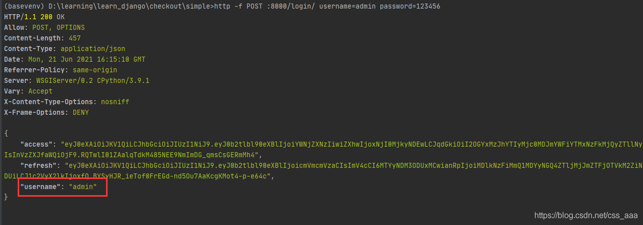http -f POST http://127.0.0.1:8000/login/ username=admin password=123456