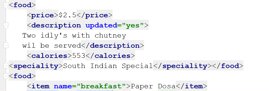 上圖顯示了對我們食品的修改描述。要添加新的子標簽,您可以使用SubElement()方法。例如,如果您想在第一項Idly中添加一個新的專業標簽,您可以執行以下操作:
