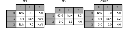 In [131]: df1 = pd.DataFrame([[np.nan, 3., 5.], [-4.6, np.nan, np.nan], .....: [np.nan, 7., np.nan]]) .....: In [132]: df2 = pd.DataFrame([[-42.6, np.nan, -8.2], [-5., 1.6, 4]], .....: index=[1, 2]) .....: