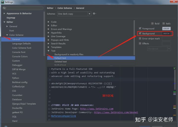 選擇File---settings---Editor---Color Scheme---選中General,在右邊框中選擇Text下的Default text
