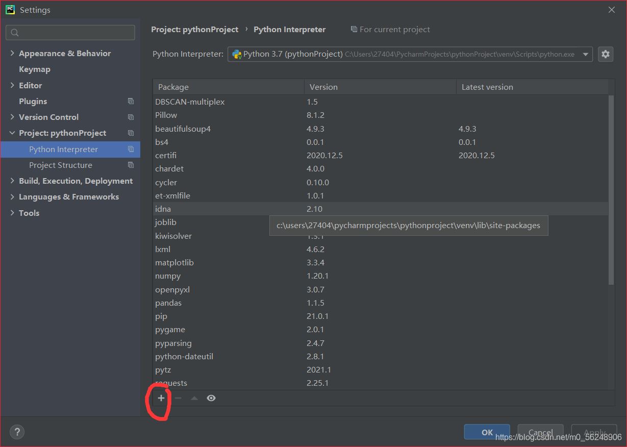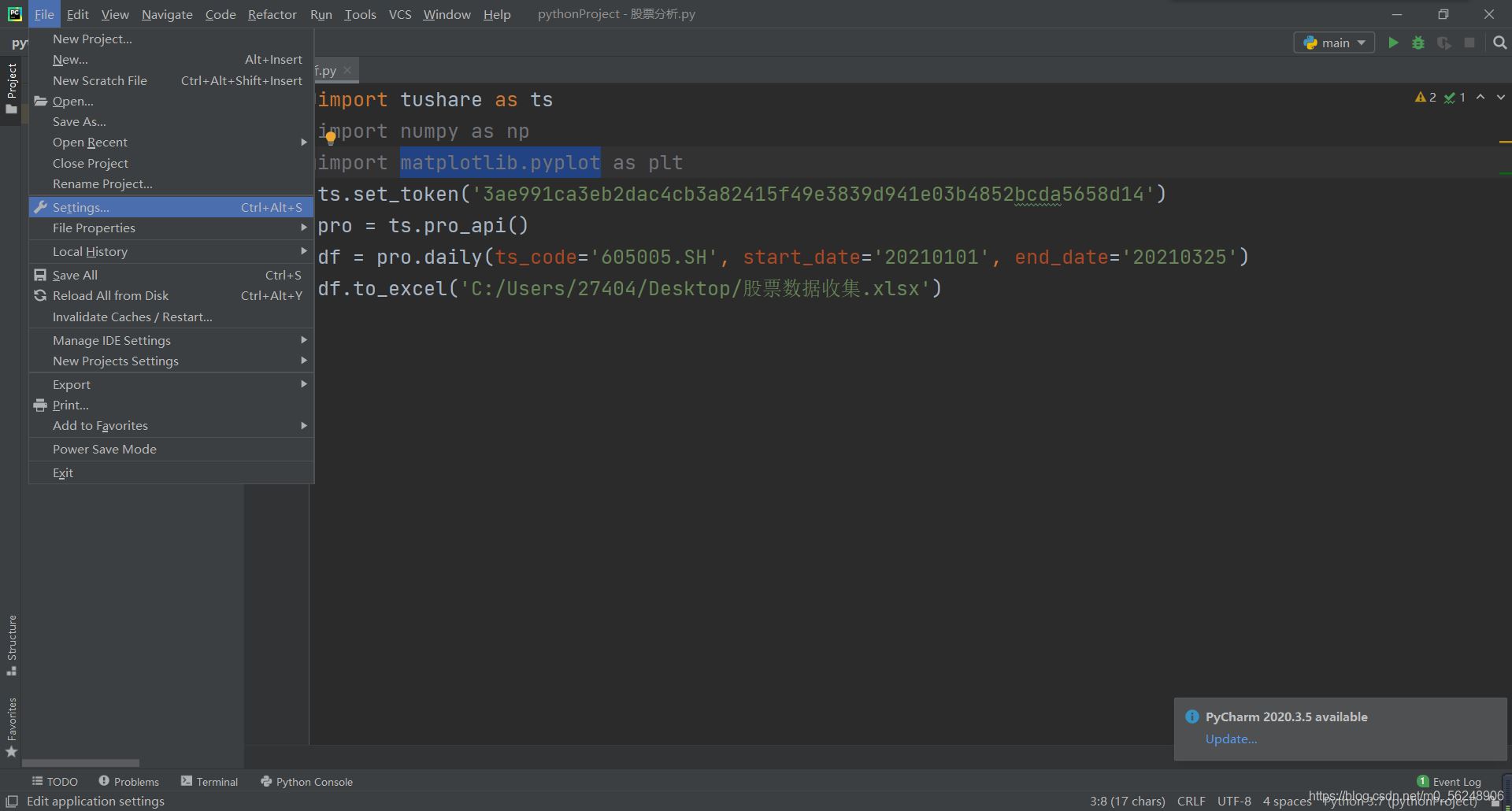 1、首先在pycharm的setting中下載三個包:numpy、tushare、matplotlib.pyplot