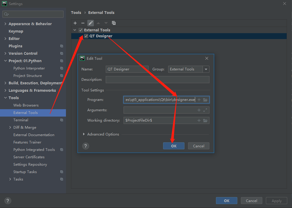 然后更新Pycharm中qt designer的啟動(dòng)路徑如下: