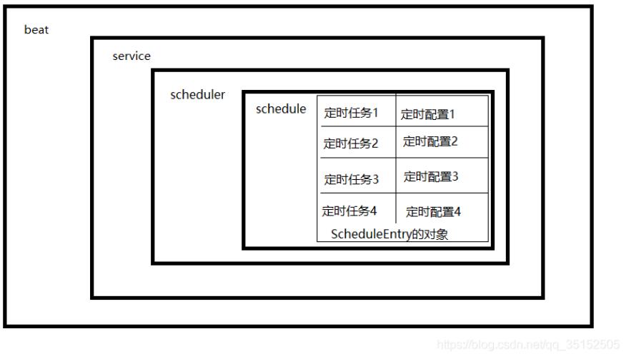 上圖是beat的主要組成結(jié)構(gòu),beat中包含了一個(gè)service對(duì)象,service中包含了一個(gè)scheduler對(duì)象,scheduler中包含了一個(gè)schedule字典,schedule中key對(duì)應(yīng)的的value才是真正的定時(shí)任務(wù),是整個(gè)beat中最小的單元。