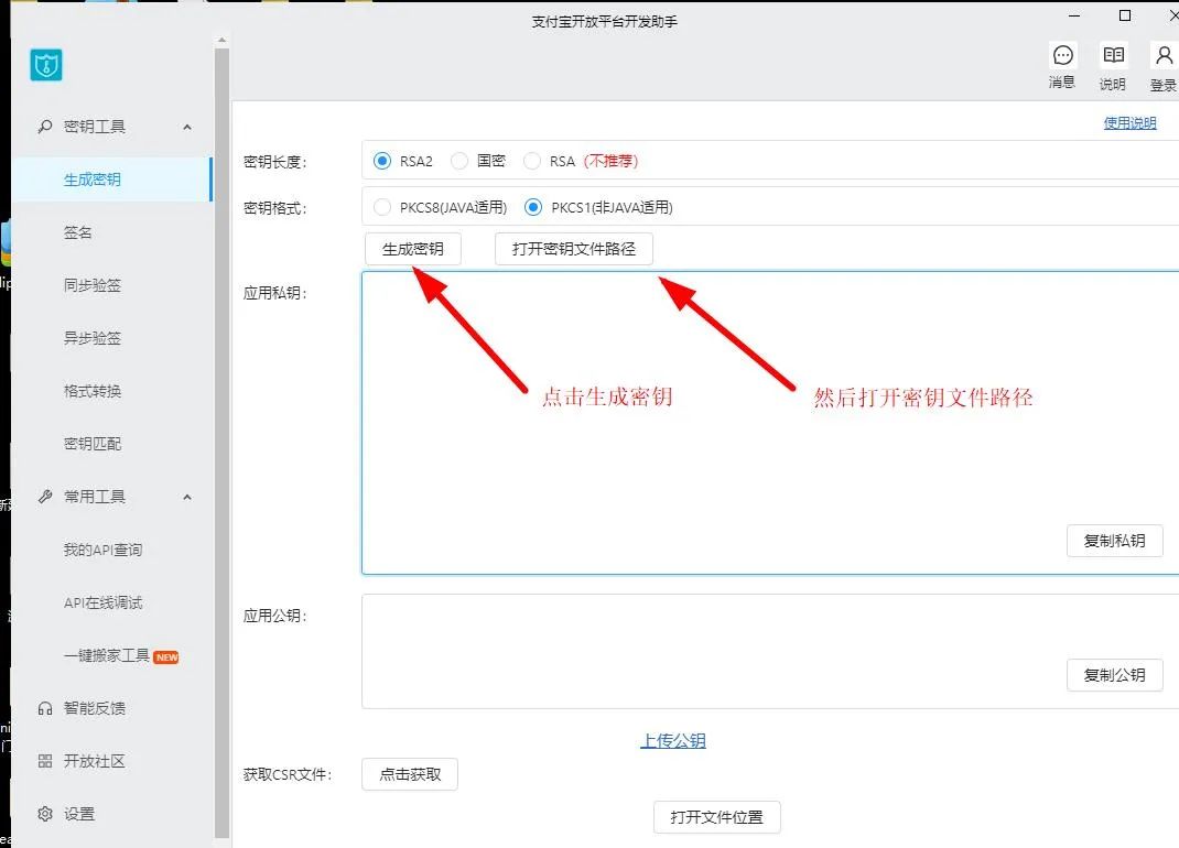 然后點擊RSA2(SHA256)后面的設置,點擊公鑰并下載支付寶密鑰生成器或者openssl來生成密鑰,這里我選擇支付寶密鑰生成器,如圖: