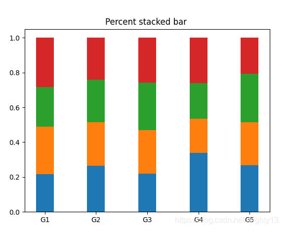 使用matplotlib創建百分比堆積柱狀圖的思路與堆積柱狀圖類似,只不過bottom參數累計的不是數值而是百分比,因此,需要事先計算每組柱子的數值總和,進而求百分比。