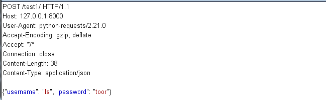 curl -H "Content-Type:application/json" -X POST --data '{"username": "ls","password":"toor"}' http://127.0.0.1:8000/test1/