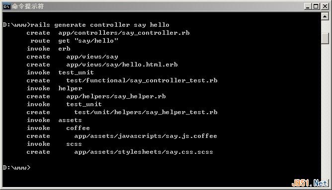 Rails是一個MVC框架,Rails接收來自瀏覽器的請求,對請求進行解讀以找到合適的控制器,再調用控制器中合適的方法。然后,控制調用合適的視圖,把結果顯示給用戶。Rails提供了快速創建視圖和控制的方法,打開CMD命令窗口。進入到剛才的www項目目錄,輸入命令:rails generate controller say hello 如圖: