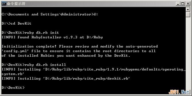 2) 打開 CMD 窗口,進入 D:\DevKit 目錄,輸入ruby dk.rb init 。#生成config.yml,這里會檢查將要添加DevKit支持的Ruby列表,只支持通過RubyInstaller安裝的Ruby。