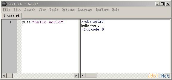 安裝SciTE后,打開它,我們輸入代碼 puts "hello world" ,點擊菜單=>file=>save 保存文件為test.rb。 然后按鍵盤F5,右側輸出窗口出現結果。如圖: