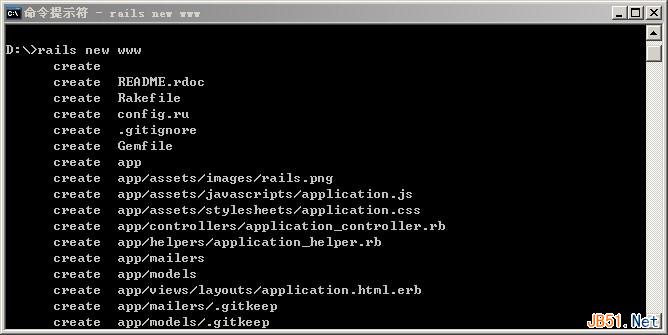 打開CMD提示窗口,進入D盤,輸入指令:rails new www ,會在D盤創建名稱為www 的rails項目結構。