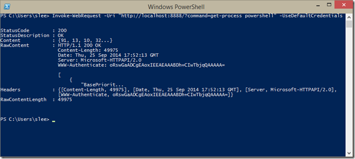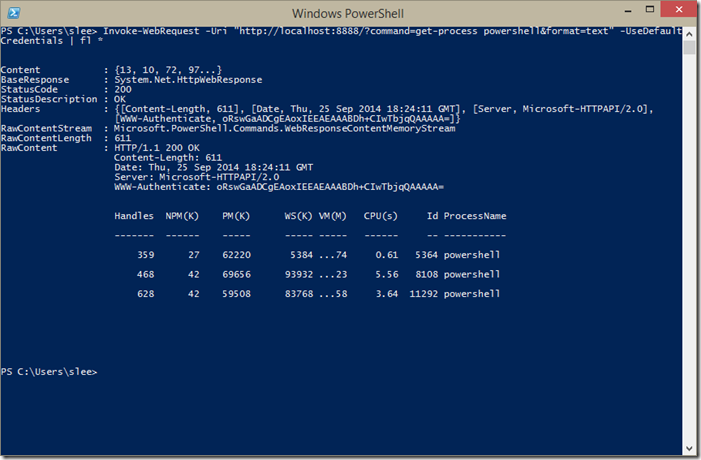 默認我讓它監聽在8888端口,集成了Windows驗證,但是仍然可以在參數中配置。這里我打開了另一個PowerShell窗口,并執行了“get-process powershell”