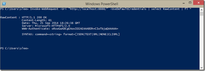 注意我使用 –UseDefaultCredentials來確保使用我的當前安全上下文來驗證,否則你會被告知匿名訪問不支持。